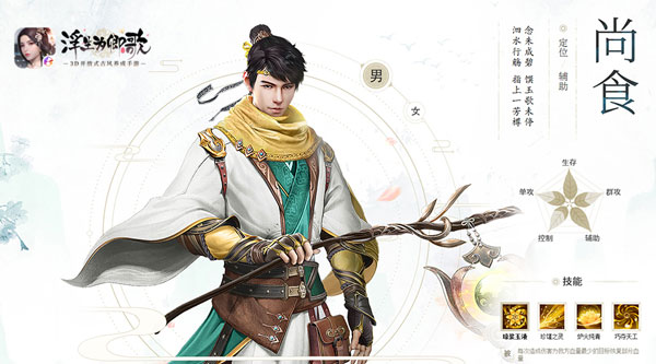 在手游中,尚食属于辅助型的定位,因为职业本身又拥有非常高的生存能力,所以在战斗中,尚食对于队友来说,就有如春风抚细柳般温暖细腻。一个有尚食的队伍,战斗过程会更加的轻松,回复、伤害、驱散等等效果一应俱全,四技能在不同的时刻使用,也能发挥出截然不同的关键作用。不同于《浮生为卿歌》手游的其他3D职业形象,尚食的外观设计更加古朴翩然,给人亲切自然的感觉,在造型上,人物每一处细节都是精雕细琢,令玩家可以在游戏时可以尽情感受职业角色的独特魅力。