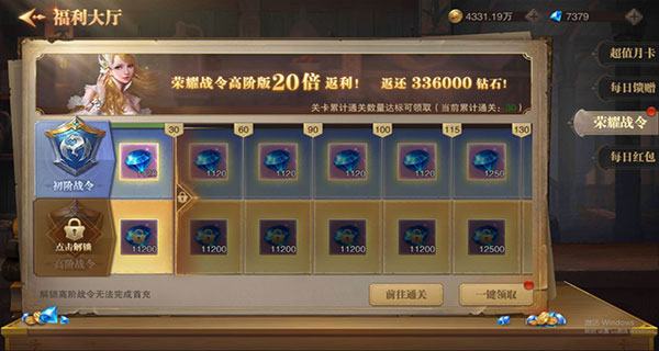 六、累计通关,即可领取初阶荣耀战令,在右上角的福利大厅界面。