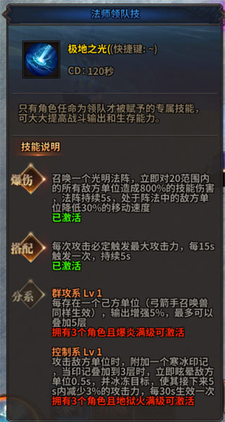 每个职业都拥有一个专属的领队技,分别为法师-极地之光、剑士-审判之剑、弓箭手-净化之力。