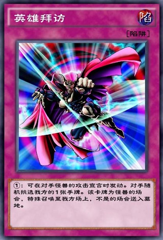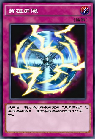 元素英雄本家陷阱,可以在回收墓地的元素英雄怪兽的同时破坏对方场上的怪兽,常在光2B卡组中配合【元素英雄 次新宇侠】,回收墓地中的次新宇侠并破坏对方场上1只1900攻击或以下的怪兽,非常的赚,缺点是只能回收元素英雄本家的通常怪兽,并且需要墓地资源的支持。