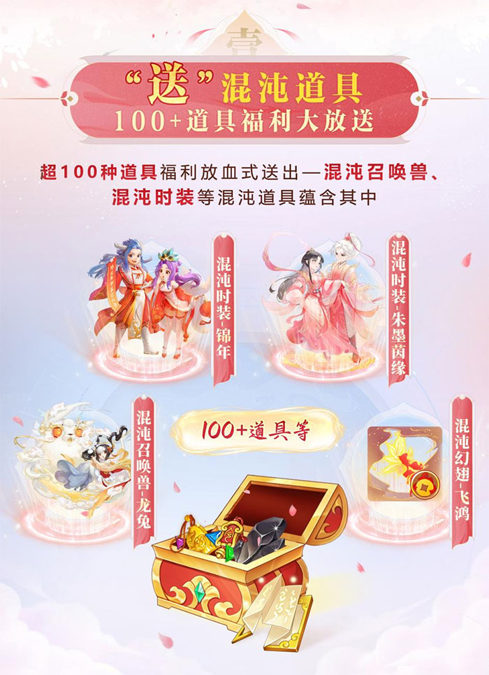 超百种混沌道具震撼来袭!跨年数字大服【2024】将连续投放四期道具福利,不仅有混沌召唤兽-龙兔,更有混沌时装-锦年、混沌时装-朱墨茵缘和混沌翅膀-飞鸿!绝版时装,精美好礼,精彩福利分期发放,每一期都有不同惊喜,你喜欢的都准备好了,就等你来带走它们!