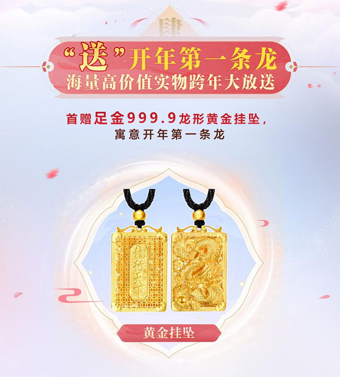 不仅各种游戏福利道具欢送不停,实物周边好礼也为少侠们准备好了!龙年将至,为大家送上“足金999.9龙形黄金挂坠男士项链”,期望大家在新的一年里,龙行天下恣意江湖,九天扶摇声动八方!