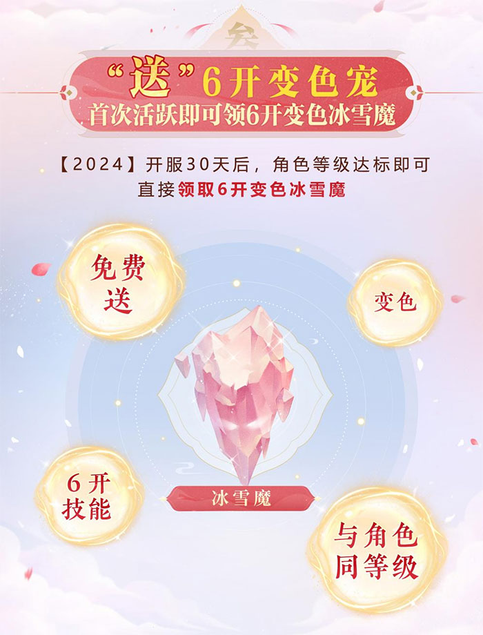 羡慕别人有变色宝宝,格子还开的多?6开变色冰雪魔你来就送!史上首次开启的重磅福利,少侠只需在【2024】服务器完成第30天的签到,就可以直接领走一只6开变色冰雪魔,同时召唤兽的等级和少侠领取等级匹配,从0级开始练?不存在!再也不用羡慕别人了,签到就送,不能错过!