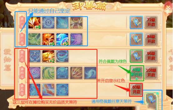 1、天策符页面。符合佩戴等级以后,开启的格子会显示绿色,不符合佩戴的格子显示为红色,天演策共分为五层,其中第一层跟第二层是只能通过自己鉴定获得相应佩戴天策符的,第三、四、五层对应天策符可以通过摊位购买无价天策符,通用格可以佩戴任意层数天策符