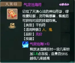 3、天策符:天策符同样为三个类型:千钧符、载物符、御兽符。其品阶分为把玩、珍藏、无价,加点1-10随机,