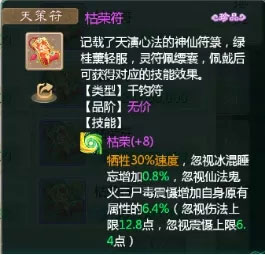 枯荣符:以+8枯荣符为例,牺牲30%速度,忽视控制增加0.8%,忽视仙法鬼火三尸毒震慑是自身原有属性的6.4%,这里就需要注意了,是忽视自身原有属性的6.4%而不是直接增加6.4%,而且还有上限。+8的枯荣法伤增加上限12.8.震慑上限6.4,所以鉴于此数据,小布不建议前期使用枯荣符!原因很简单,男人的话,敏男人牺牲速度不值,女人前期那点忽视的加成还不如直接使用载沉符来的实在,其他输出职业也一样,纯属个人观点,仅做参考!