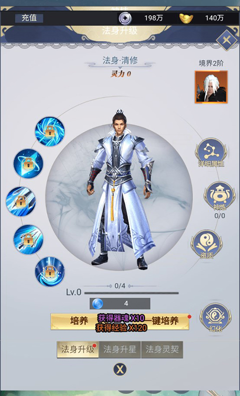 3、游戏内的法身系统是游戏角色的修仙灵体,玩家可以对其进行升级、升星、灵契等,不断提高修为,增加战力。