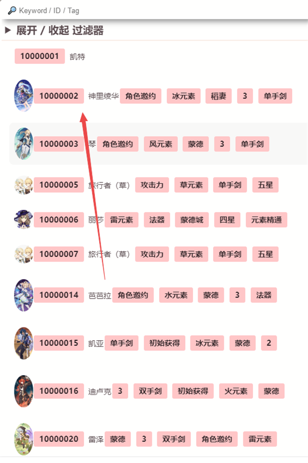 4、在角色指令代码列表里,选择你想要获取的角色,小编以神里绫华为例,