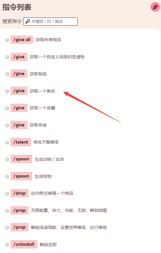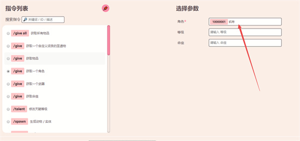 3、在指令列表中选择你需要获得的物品或角色(这里小编以获取一个角色为例),点击获取一个角色,然后点击参数,