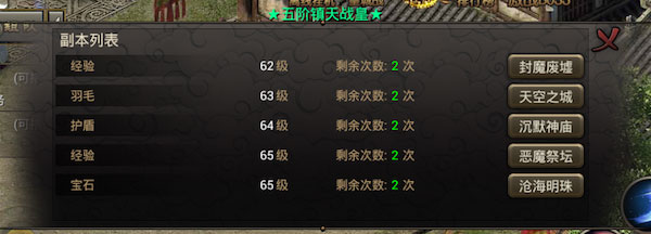经验副本是相当重要的经验获取途径,《烈焰龙城传奇》中有两个经验副本,玩家可以根据等级挑战,简简单单挂机就能得到海量经验,有条件一定要多倍领取哦,经验副本每日必做,快速升级轻轻松松!