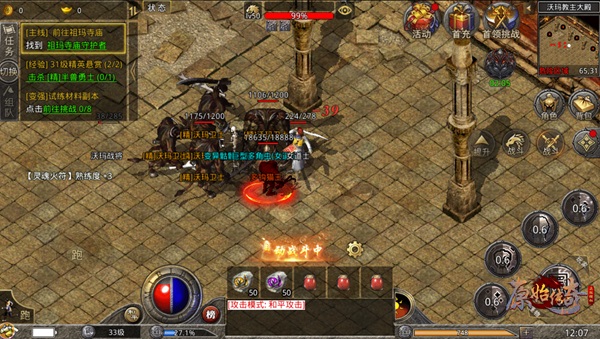 玩家在32级可开启金刚神体,通过盟重省-试炼伏魔殿NPC进入: