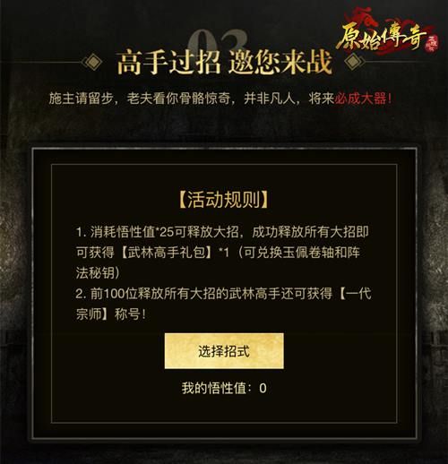 (1)消耗悟性值*25可释放大招,成功释放所有大招即可获得【武林高手礼包】*1(可兑换玉佩卷轴和阵法秘钥)