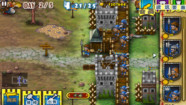 在一大批敌人的肆虐后,有些防卫建筑会出现损坏,玩家可以在下一次战斗前对其进行维修。维修需要消耗金币,但会比直接购买新的设备来的便宜。如果玩家对自己摆放的防御设备不满意,可以将其出售,重新摆放防御设备,玩家对布局的整体控制自由性比较大。除了建筑可以出售,士兵也是可以出售的,与建筑相同,出售获得的金币会比购买时花费的少。玩家对整个游戏布局的自由性分配性还是比较强的。