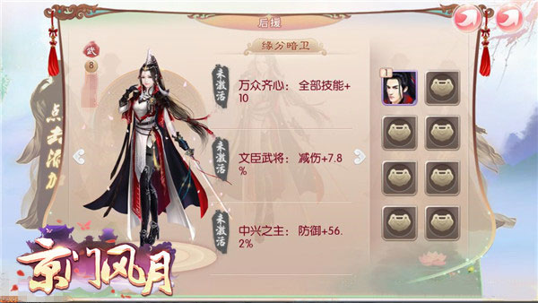1、定制暗卫培养乐趣在京门风月折扣版中,人人都可以训练自己的暗卫,平时若是上心些,每每提升自身技能的时候不忘培养身边的暗卫,使之与自己共同成长,互补所缺,才是上上策。在进阶的时候,分析暗卫们的长处,不断调整自己的暗卫力量,怕是将来走遍南秦也不怕挑事者啦,这其中的乐趣也只有培养者可以体会