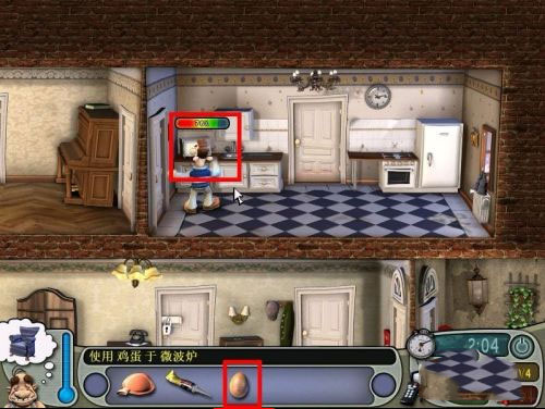 接着向右出发,从一层的门进入到二层的厨房,在右侧角落有个冰箱,从冰箱里边可以得到一个鸡蛋。