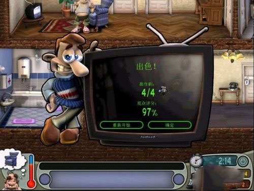 到这里,成功的四次整蛊就完成了,然后会弹出一个游戏评价,这里就可以直接继续下一个关卡了,游戏的主体任务就是这样,利用房间的各种道具整蛊房间主人,最后整蛊成功顺利过关。
