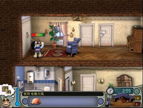 接下来趁着房间主人在厨房,赶紧在卫生间旁边的那个人进入到二层的看电视的地方,电视上有两根天线,果断将两根天线给扭在一起,房间主人回来看到电视不能看了,又被气了一次。