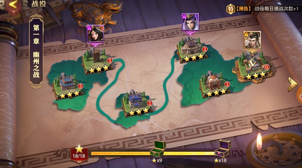 当我们通关主线章节之后,还将解锁战役玩法。通过挑战高难度的战役,获得特定主将的角色碎片,提升我们主将的星级。完美三星通关战役之后,星星累积到一定数量,还将获得丰厚的元宝奖励。