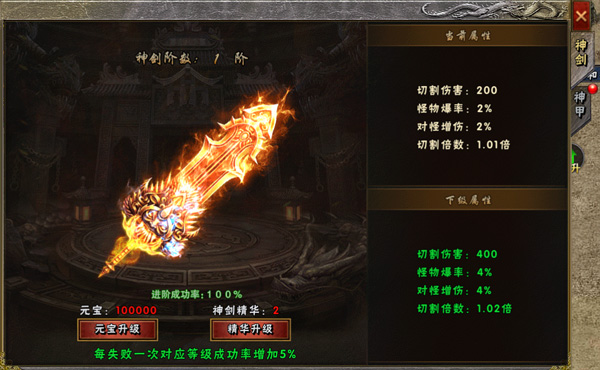 4、前期使用元宝优先提升神器系统,可提升高额对怪增伤、受怪减免属性,还能提高打怪爆率!