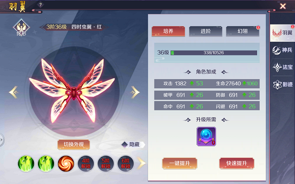 2、羽翼进阶后不仅可以获得全新的羽翼外观,还可解锁强力被动属性;