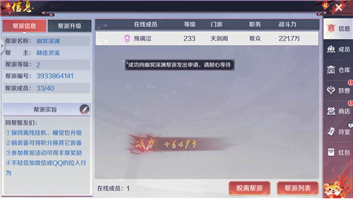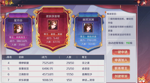 其中一键申请就会加入一些没有设置审核的帮会中,不过这些公会一般都比较弱,小编不太推荐大家使用。而申请加入则是需要审核的帮会,当然如果你对自己的实力比较自信的话,也可以联系帮主来谈条件。后面两种帮会一般都是比较强的公会,只会筛选一部分厉害的玩家加入。