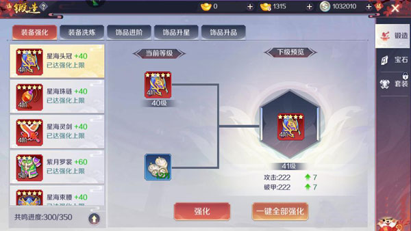 强化:强化是提升装备属性能力的一个基础操作,可以有效的提升装备的主属性能力。而在花费上面也是相对的较少,只需要玩家提供足够的银币即可进行强化。强化的等级上限和角色转职有关,所以想要获得较多的强化加成,等级就需要玩家做好提升。而强化界面做下角还有一个共鸣进度,当装备总共的强化达到一定等级的时候可以激活,能够获得额外的属性加成。