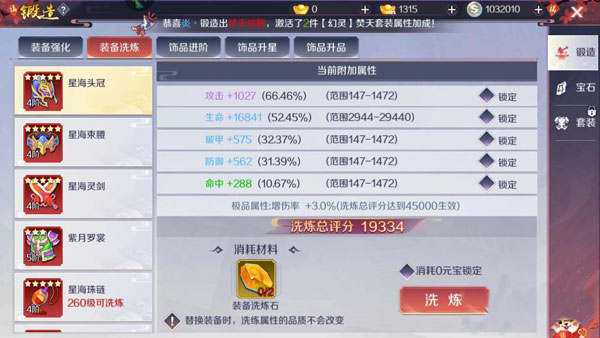 装备洗炼:该玩法对于装备的基础能力提升是非常大的,通过洗炼操作,可以将基础属性的范围提升。属性分为白色、蓝色、紫色和金色这几个品级,颜色越好属性就越高。在洗炼出这些极品属性的时候,玩家需要用绑元锁住,如果不锁的话继续洗练会直接替换掉。洗练会消耗装备洗炼石道具,随着装备品级的增加,消耗的数量也会提升。