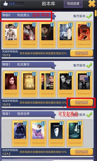 上图我们可以看出,当一排剧本全部获得并全部完成剧本“镀金”后,我们才可以进行剧本的挑战,并且此时剧本挑战所产生的额外效果加成是针对这一排剧本内所有剧本而言的。剧本挑战每完成一次,将会提升原有拍摄属性加成1%,等级也会随之上升1级(随等级提高而变化)。