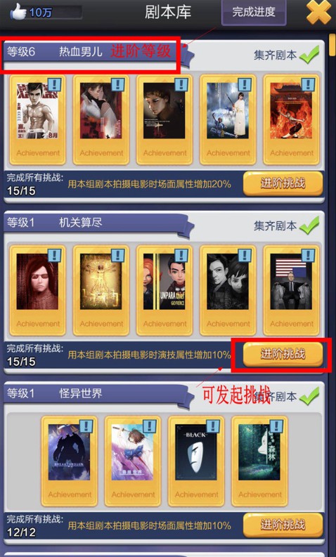 发起挑战后,系统随机给出三个挑战任务(有难有易),并标明当剧本挑战完成后,剧本属性将会获得怎样的提升(上图中由等级5进阶至等级6,用本组剧本拍摄电影场面属性在原有20%的基础上提升至21.5%),挑战时间限制为一周。