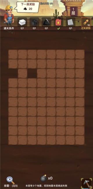 第一层不用考虑那么多,直接一路点过去就行了,上面的物品就是需要挖出的数量才能达到通关条件,最右上角的是通关的奖励。