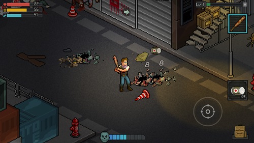 1、进入游戏后,我们会在地上捡到一根棒球棍,这就是我们的初始武器了,直接点击屏幕左下角的攻击按钮就能自动攻击自己身边的僵尸。