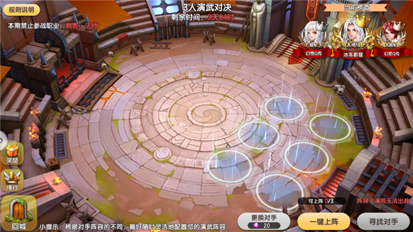 关于演武场每周一12点都会开启新一轮的活动,持续到周五的21点活动结束。每期的演武场活动会在3v3和5v5的形式之间轮流开放,每轮活动会安排某两种职业的英雄不可上阵与参战,需要城主大人在参与演武场活动时做好准备和对策。挑战胜利会增加演武积分,连续胜利会有积分加成,战斗失败则不扣除演武积分,建议根据对手阵容不同随时灵活配置演武阵容哦~