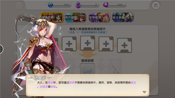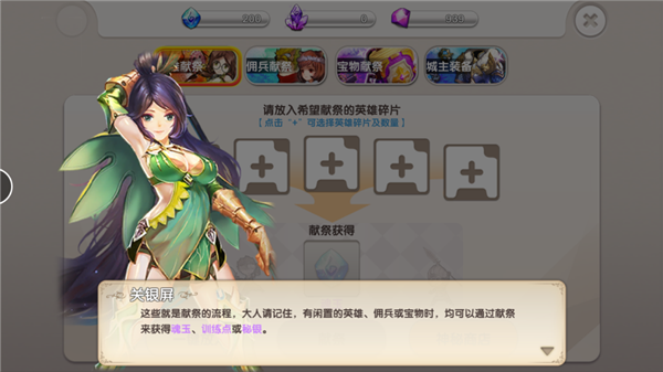 2、献祭英雄碎片、1级佣兵、宝物、城主装备来获得相关素材。