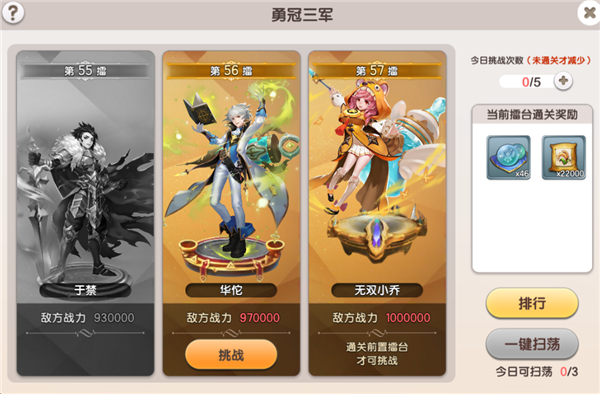 勇冠三军每日可免费获得3次挑战次数,获得三星胜利可挑战下一擂台,3星胜利不扣除挑战次数,未达3星胜利或战斗失败会扣除1次挑战次数;而当挑战次数为0时,可额外增加挑战次数(使用钻石,每日10次);每日城主大人可通过一键扫荡快速获得全部已通关的擂台奖励。
