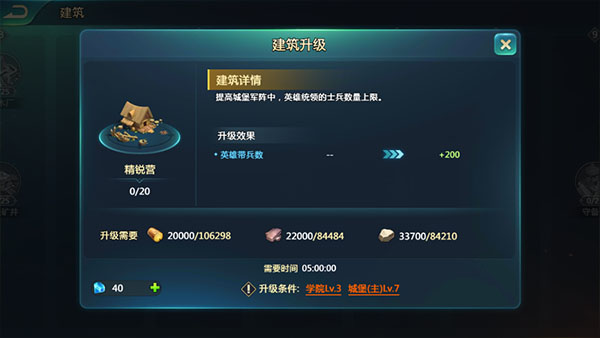 所以该时期领主可以优先以升级精锐营为目标,先升级7级城堡和3级学院, 再升级精锐营。