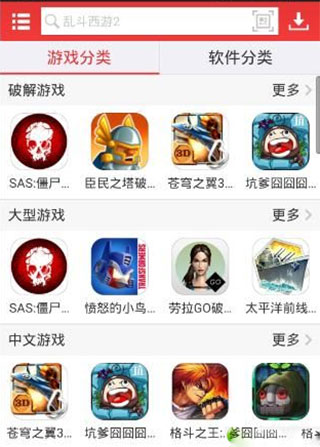 5、你也可以在分类界面,把游戏详细的分类,有破解游戏,大型游戏,中文游戏,休闲益智,选择你喜欢的游戏
