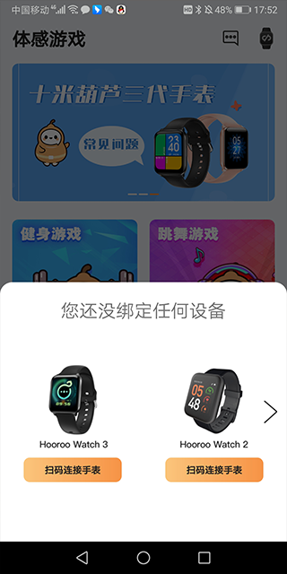1、(该功能需配合HOOROO WATCH一同使用)打开手机蓝牙,将HOOROO WATCH与十米葫芦APP连接,在十米葫芦APP内点击游戏即可进行体感游戏