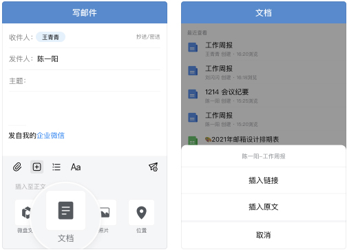 可在邮件中插入聊天记录、文档、微盘文件、日程等,也可将文档内容添加至邮件正文中,高效组织邮件内容。
