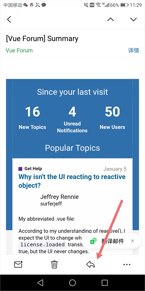 3、点击页面右下角的回复按钮,有点像一个“箭头”。