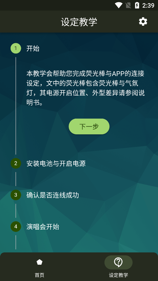 1、本教学会帮助您完成荧光棒与APP的连接设定,文中的荧光棒包含荧光棒与气氛灯,其电源开启位置、外型差异请参阅说明书。