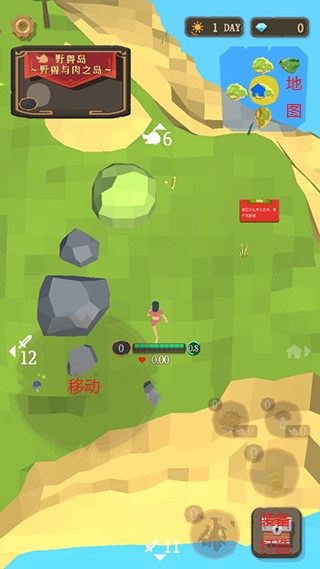 3、我们可以通过左下方的按钮控制角色移动,需要在野兽岛上寻找食物和材料,让自己生存下去,