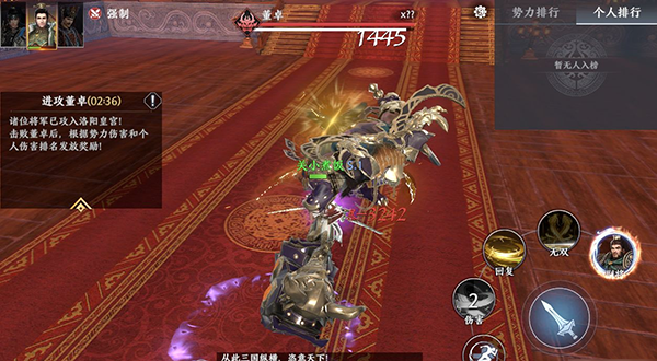第三关为洛阳皇宫,这一关需要挑战BOSS董卓,同时会根据势力伤害、个人伤害进行排名,发放奖励。