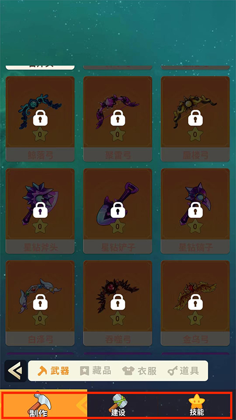 6、在制作栏目,可查看已拥有和为拥有的武器、藏品、衣服和道具,还可以进行升级,