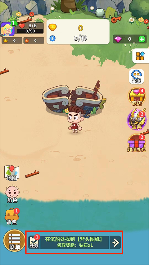 10、进入任务界面,需要在沉船处找到【斧头图纸】,触控屏幕,摇杆操作角色移动,