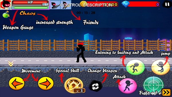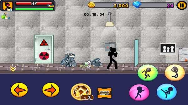 既然愤怒的火柴人7是作为系列的延续,在操作方面同样采用比较常见的虚拟摇杆控制,左边箭头是控制方向按钮,右边是攻击以及跳跃按钮,UI设计上相比前几代要更加形象,即便是新人也能凭借按钮UI的设计,实现快速上手。另外,游戏中可以购买各种武器,然后通过不断的杀敌来赚取金钱再进行升级。