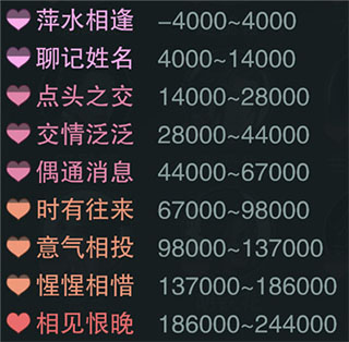第三种就是真·NPC,每人每天的好感度上限是10000,回礼要更次一些,送同样的物品涨的好感度是基本是第二种的1.6倍,同样是一级宝石,涨的好感度是600,比如那个碰瓷的玲珑坊管事……别问我是怎么知道的谢谢……我心疼我本来拿来送香帅的20块宝石……这种NPC除了特殊需要,大家就不用刷了,坊间传言给混混刷好感度就不会被碰瓷,我认为并不靠谱,大家可以去试试emmmm