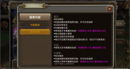 6、国战玩法是这款游戏的主题,国家与国家的碰撞,成千上万玩家的战斗。非常的考验,国王的指挥和调度能力。每个国家的国王会在每日18点由帮会排行榜上第一帮会的帮主担任。国王也是一个国家权力的象征,有着很多系统奖励和权力。一个好的国王,可以让一个国家更加的强大。
