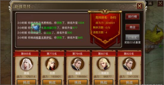 5、PK系统在游戏中也有很多玩法。擂台是单人1V1的竞技。大家可以得到积分和排名的奖励,换取每个职业需要的技能书,并且技能书都有不同的增加原有技能的效果。玩家可以根据自己的需要的选择。