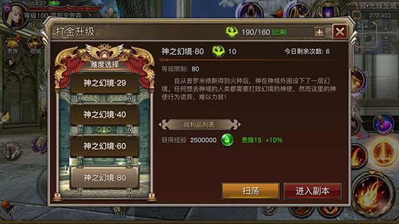 虽然说等级不是决定战力最重要的因素,但也对战力提升有非常直接的影响,尽管到了游戏中期,升级速度有所减缓,但是跟上主流玩家的升级速度也属当务之急。每一级等级提升后的技能提升、装备升级提升以及升级人数属性提升,都对战力提升有帮助。提升贵族等级至7级增加神之幻境每日可完成次数、购买黄金特权卡,让贵族福利增加次数翻倍,让每日可完成6次神之幻境副本,这些都是可以额外获得经验的途径,各位玩家可以参考。
