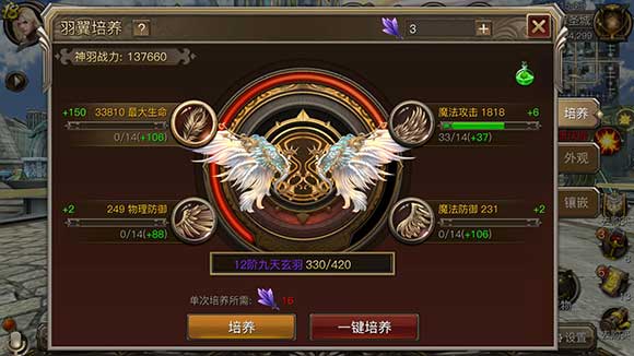 每件羽翼在成功获取并使用激活后,人物会获得羽翼附带的激活属性,例如:激活路西法之翼后,可获得羽翼激活属性,暴击等级+300。因此,尽可能多参加活动获得新的羽翼,不仅外观好看,对战力加成也非常有帮助!